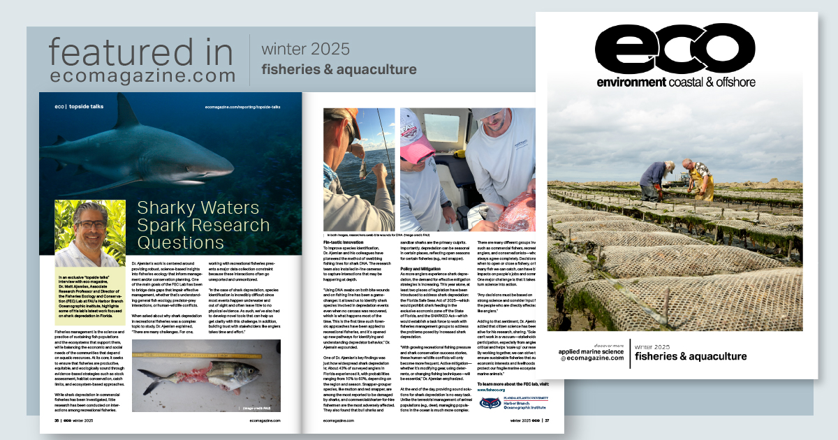 In a recent "topside talks" interview with ECO Magazine, Matt Ajemian, Ph.D., associate research professor and director of the FAU Harbor Branch Fisheries Ecology and Conservation Lab, highlighted some of his lab's latest work focused on shark depredation in Florida.