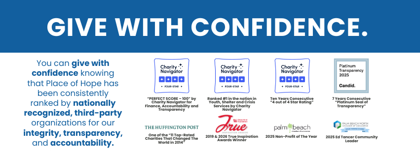 Place of Hope’s excellence and accountability has been consistently recognized by independent evaluators including Charity Navigator and Candid, ranking us among the nation’s top charities for transparency, stewardship, and measurable outcomes.