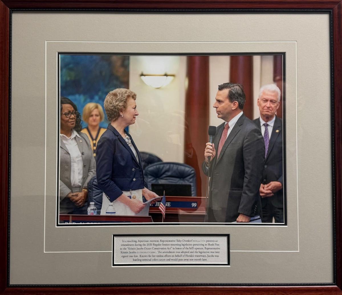 Walking by the hallway I noticed a couple new pictures hung up, and I was so awed to recognize a frame from one of my favorite moments of my legislative career. This picture was taken during the 2020 session when I introduced an amendment to rename legislation pertaining to Shark Finning to the “Kristin Jacobs Conservation Act”.